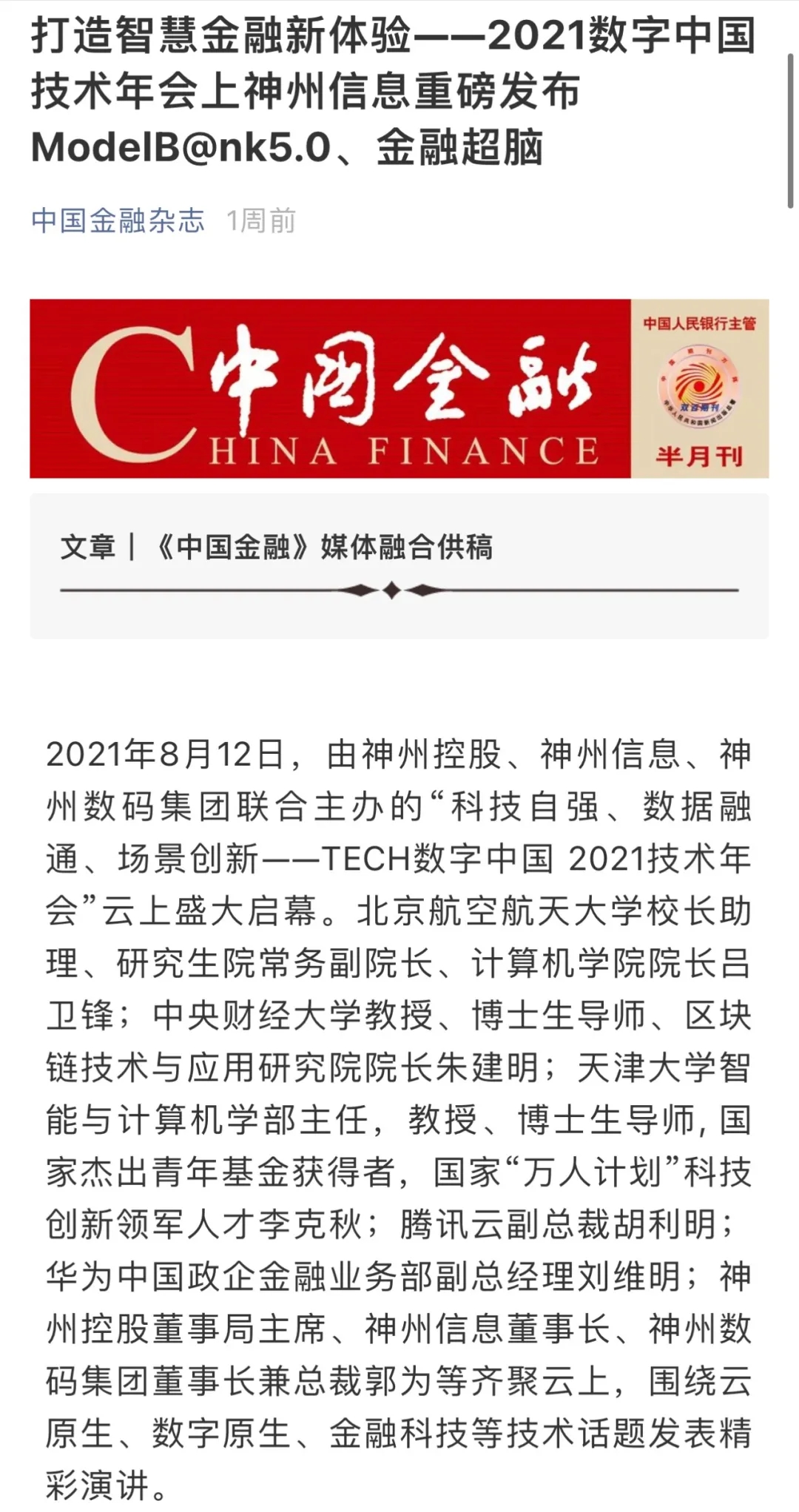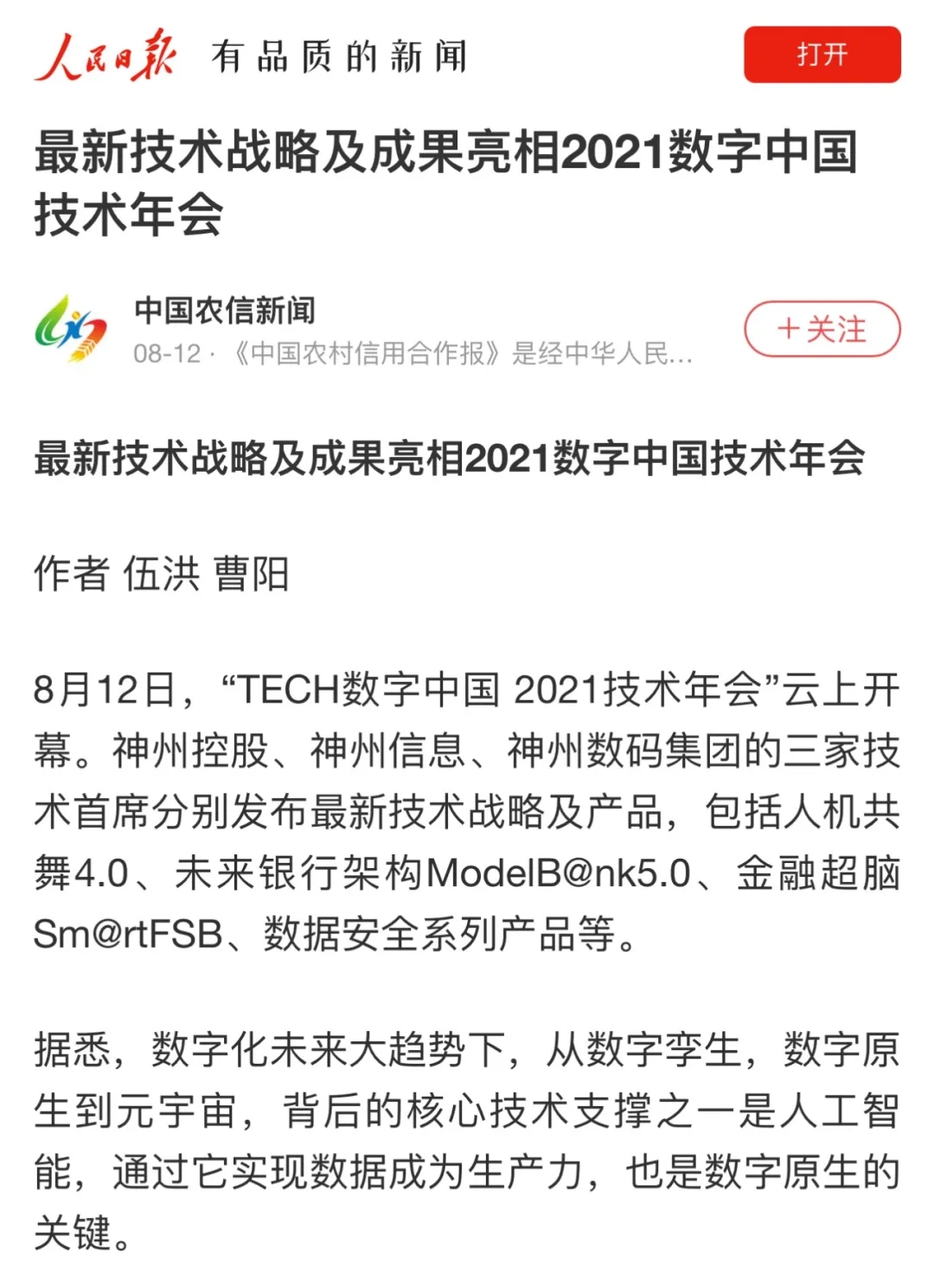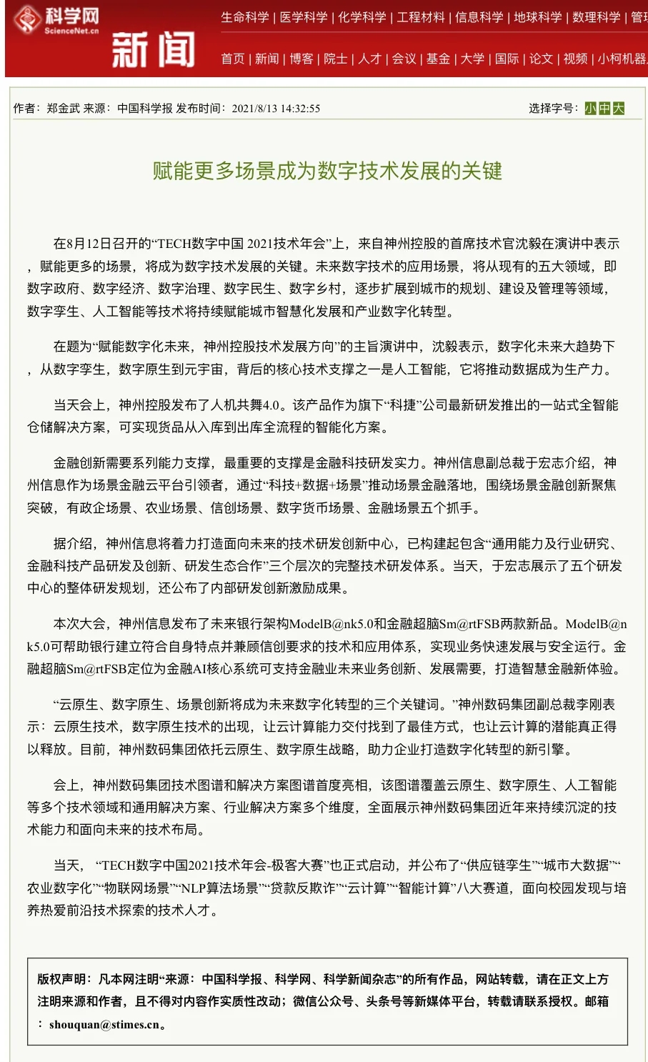 8月12日,由神州控股、神州信息、nangong28.com集团联合主办的“科技自强、数据融通、场景创新——TECH数字中国 2021技术年会”云上盛大启幕,发布神州信创云、ModelB@nk5.0、金融超脑Sm@rtFSB、云原生数字化安全底座、园区智能体等重磅产品,国内各大权威、影响力媒体多角度多频次对盛况进行报道!