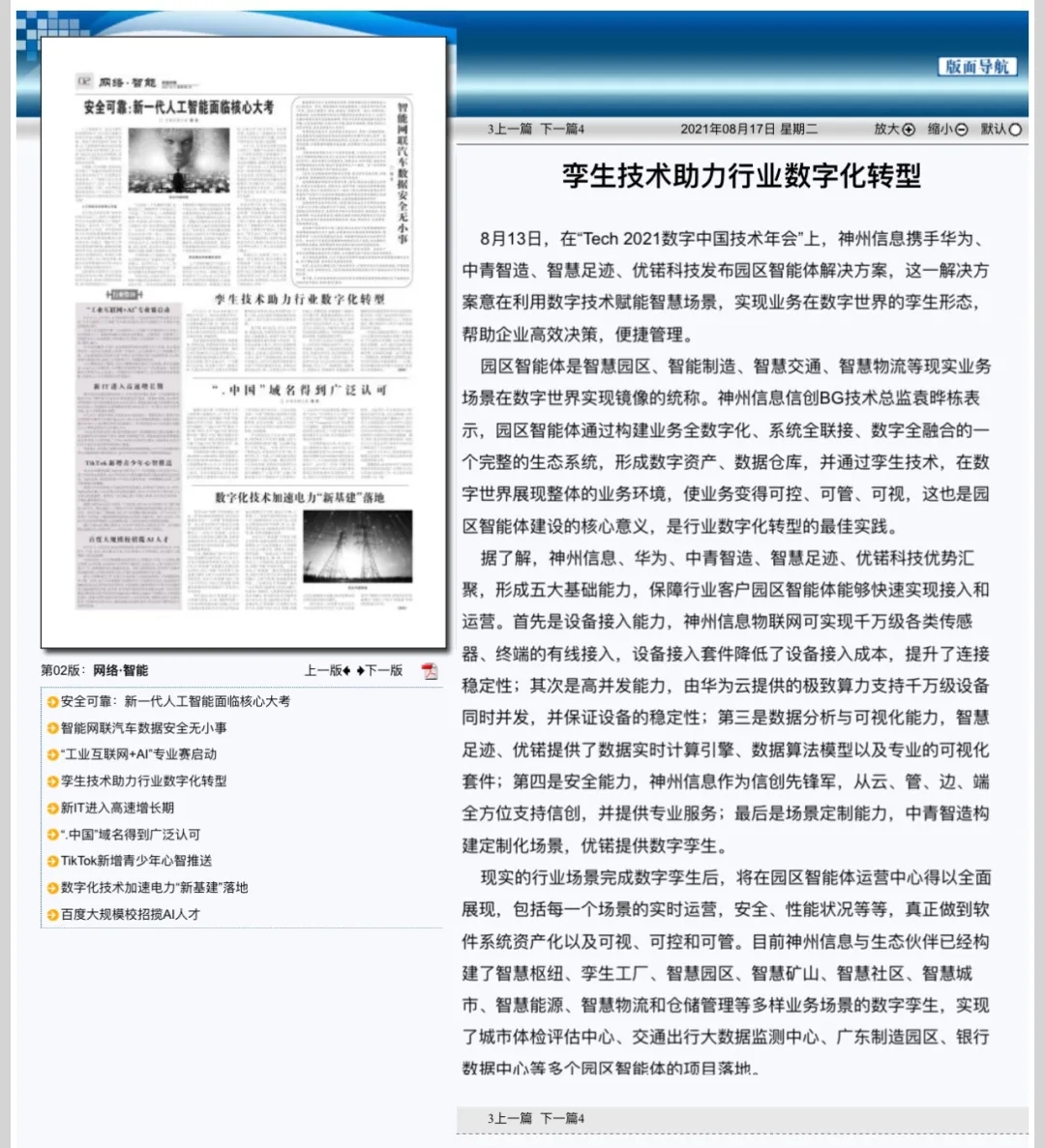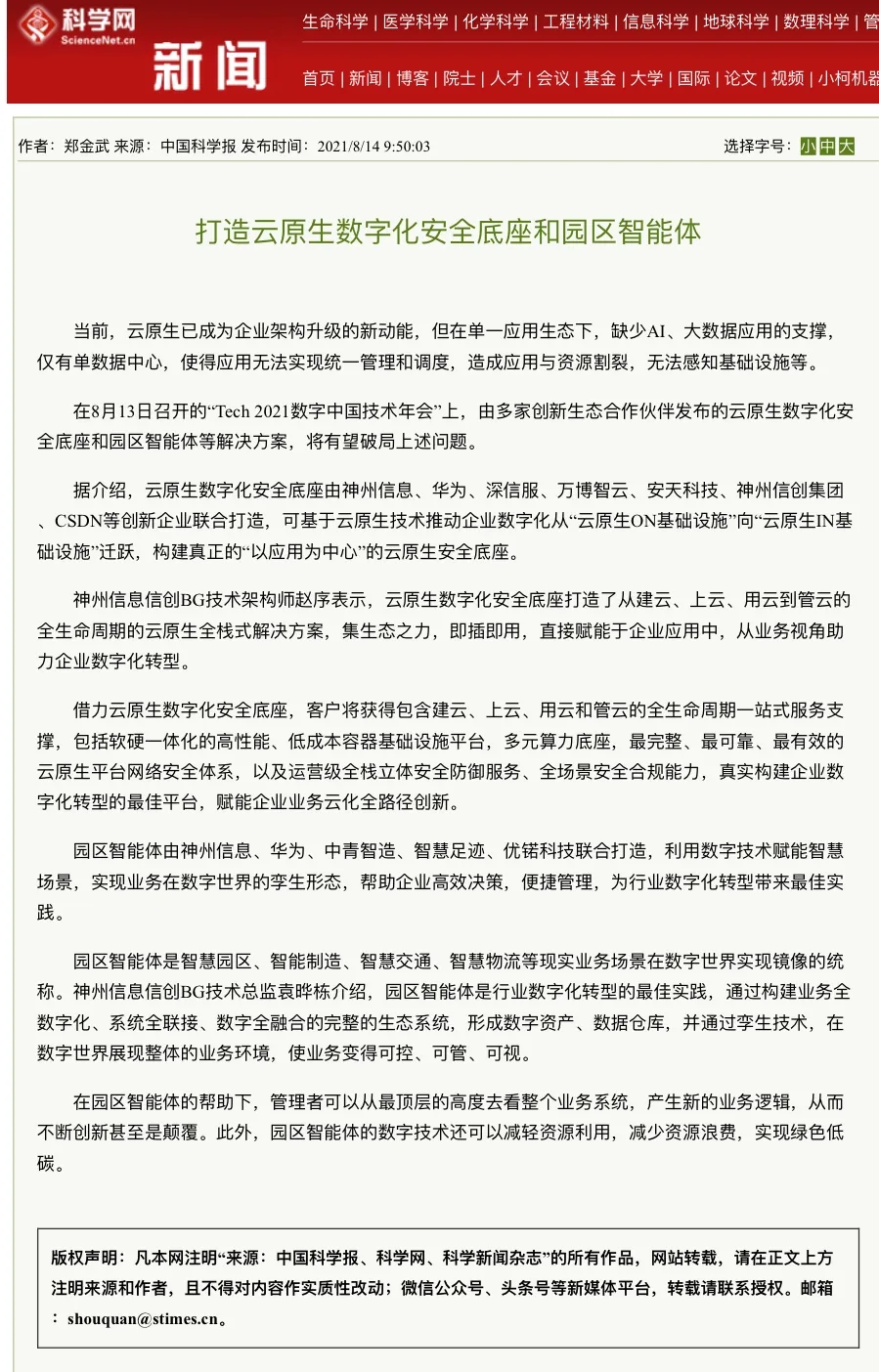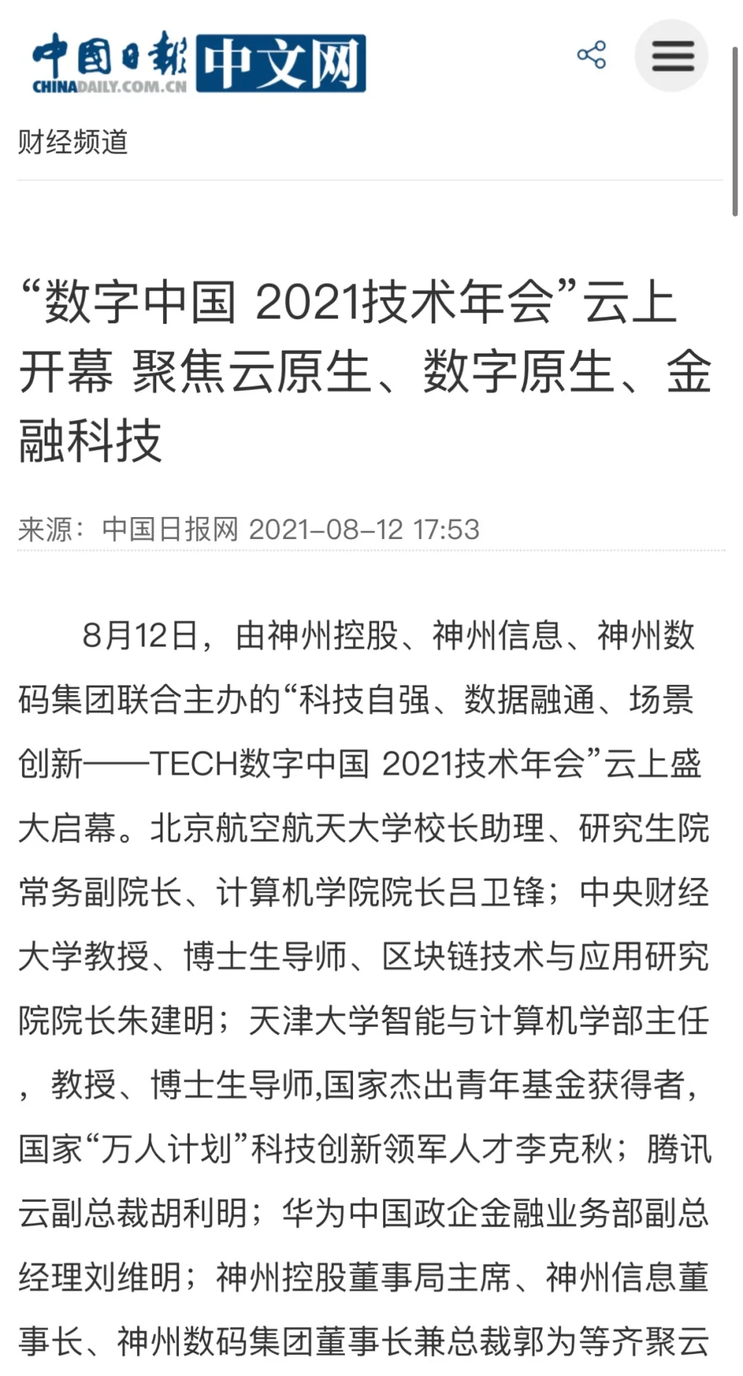 8月12日,由神州控股、神州信息、nangong28.com集团联合主办的“科技自强、数据融通、场景创新——TECH数字中国 2021技术年会”云上盛大启幕,发布神州信创云、ModelB@nk5.0、金融超脑Sm@rtFSB、云原生数字化安全底座、园区智能体等重磅产品,国内各大权威、影响力媒体多角度多频次对盛况进行报道!